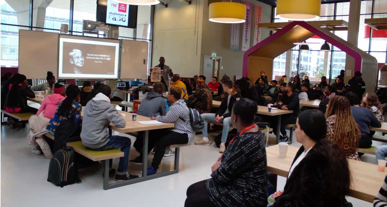 Activist Mitchell Esajas die samen met Jerry Afriyie enkele weken geleden de rechtzaak won tegen de blokkeerfriezen, gaf een korte presentatie over het ontstaan van zwarte Piet en waarom hijj zich ertegen verzet. “Er zijn mensen die zwarte Piet genoemd worden vanwege hun huidskleur. IK heb het nooit meegemaakt, maar mijn moeder wel. Neven van me. Vrienden van me. Ik wil in een land wonen waar onze kinderen dat niet meer hoeven mee te maken,” vertelde hij de zaal die aan zijn lippen hing. “Ik hoop dit in de toekomst niet meer te hoeven doen; maar naar hier te kunnen komen met deze rolmodellen om onze jongeren te laten zien wat kan.”