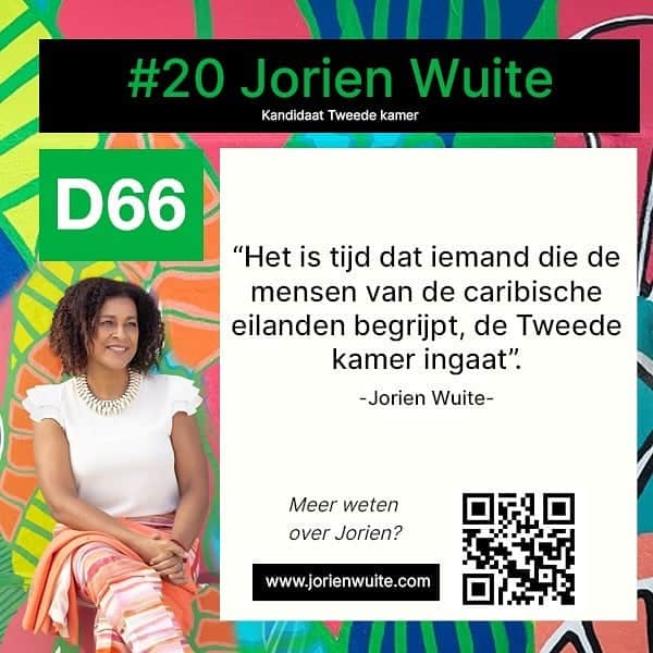 Het gaat om representatie, men moet zich herkennen: in de onderwerpen en in de mensen. Daarom is mijn eerste boodschap: Gebruik die stem, moffel het stembiljet niet weg in een lokaal krantje om ‘m daarna te vergeten of weg te gooien. Neem de tijd, kijk bewust, waar sta je, wat wil je en stem. Het zijn echt hele belangrijke verkiezingen in een ernstig polariserend klimaat. Met D66 zet ik in op solidariteit met en het versterken van de Caribische mensen, hier en op de eilanden. Dat heeft te maken met de sociale omstandigheden, met een sociale economie, het hebben van mooi werk, een gezamenlijk klimaatfonds dat ook voor de Cariben is en goed onderwijs dat de jongeren meer kansen geeft.