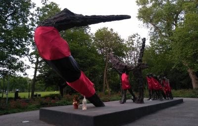 Het Oosterpark was nagenoeg leeg, met maar een klein groepje hoogwaardigheidsbekleders, uitgenodigden en pers aanwezig bij het Slavernijmonument. Het was er zo stil dat je de felgroene halsbandparkieten die Amsterdam thuis noemen, kon horen kwetteren door de speeches heen. Het monument was omzwachteld met rode en zwarte lappen, een hint naar rouwrituelen van het Akan volk in Ghana, waar veel totslaafgemaakten van ontvoerd zijn. Het was een sobere ceremonie.