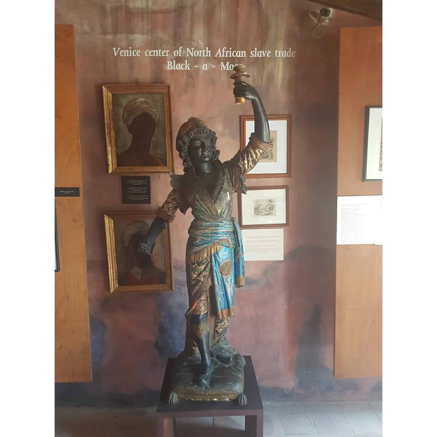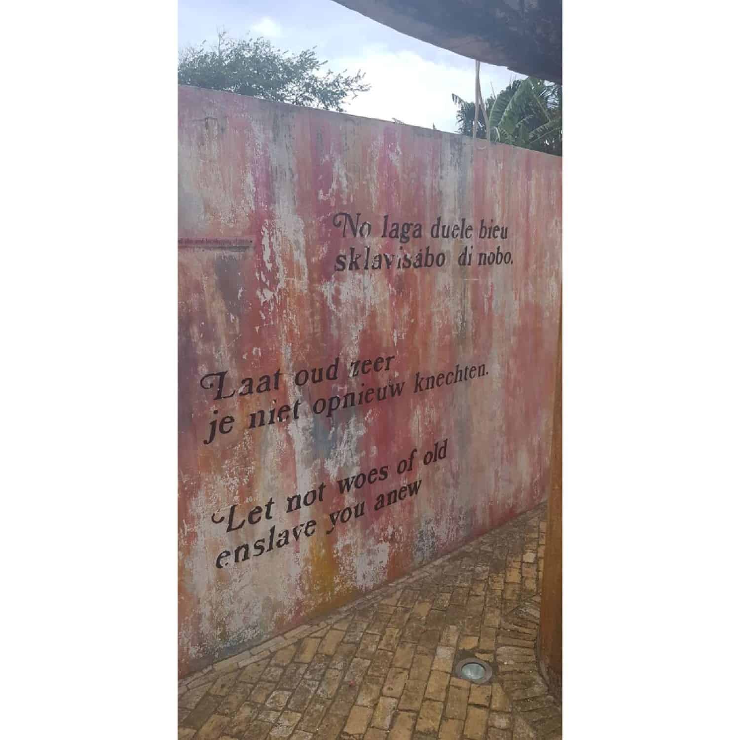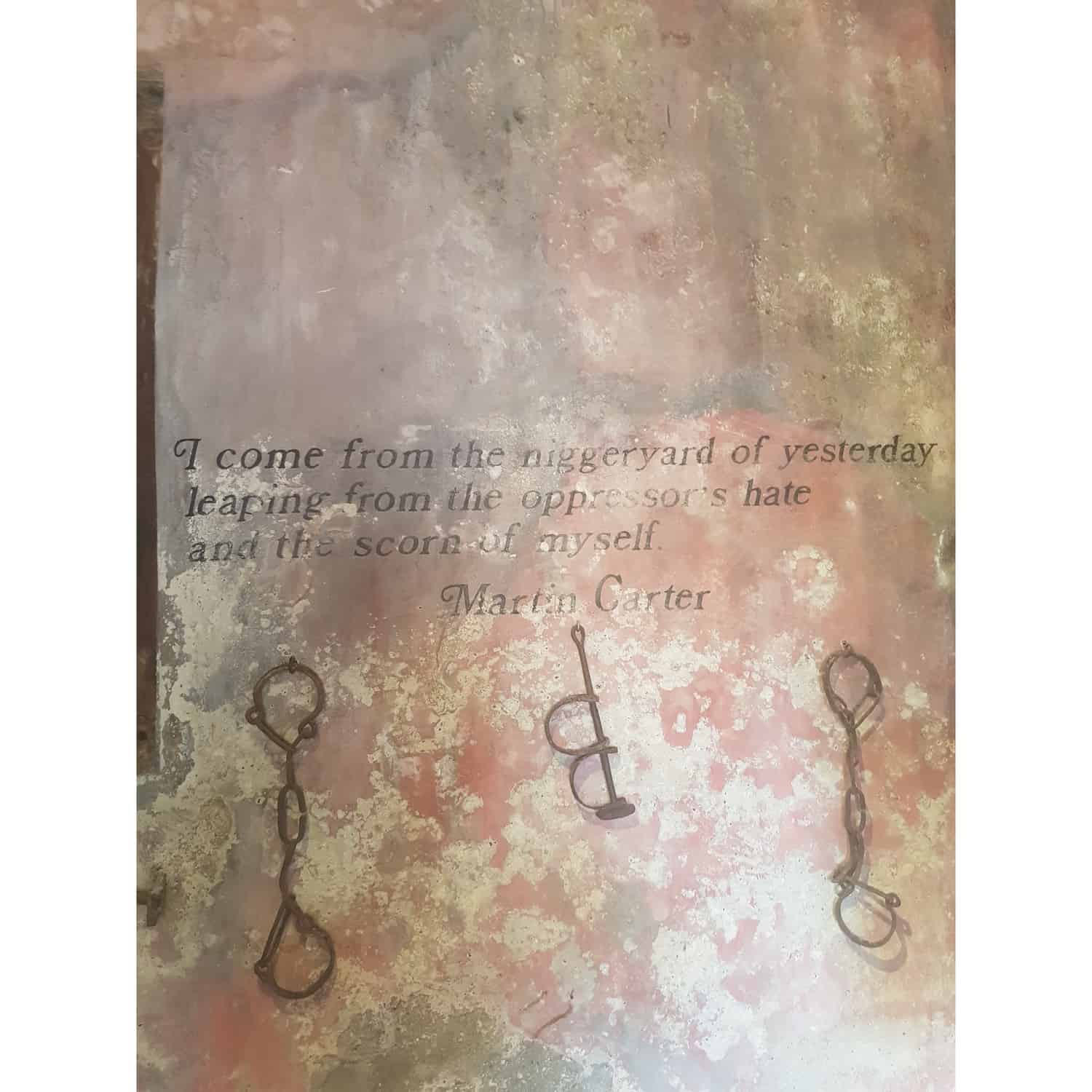 We stappen het gebouw binnen waar het slavernij gedeelte begint. We staan direct oog in oog met een standbeeld: een moor. De berenklauwen, de handboeien, alles wordt tentoongesteld. Alles wordt toegelicht dmv een bordje met een korte tekst of een groot bord met wat uitgebreide informatie. Alles wordt geschreven in het Engels, Nederlands en/of Papiamentu. Mijn maag draait. Ik krijg een brok in mijn keel zodra ik de quote van Martin Carter zie staan op de muur: ‘I come from the niggeryard of yesterday, leaping from the oppressor’s hate and the scorn of myself.’