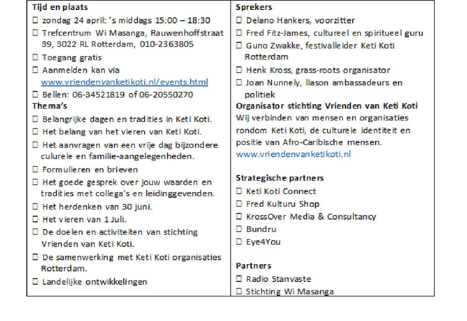 Tijdens de themadag in Trefcentrum Wi Masanga (Rauwenhoffstraat 39, 3022 RL Rotterdam) op zondag 24 april 2016, start Vrienden van Keti met een “proces om iedereen bewust te maken van het belang om op 1 Juli vrij te zijn en het te vieren met geliefden, familie, vrienden, collega’s en buren.”