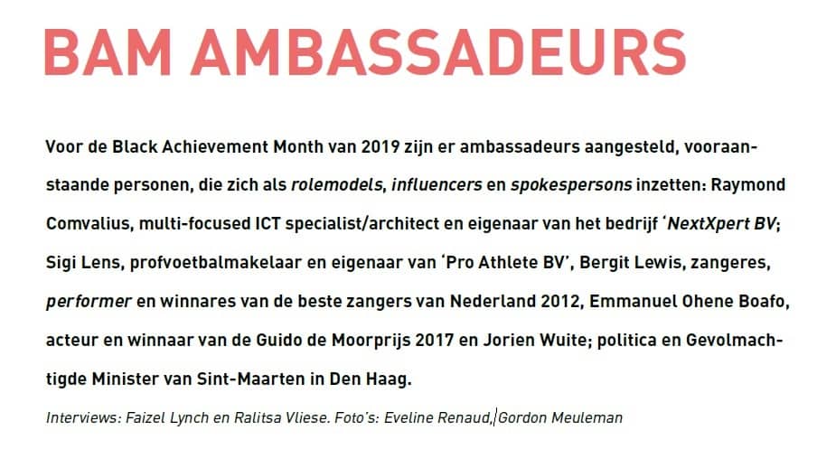 Raymond Comvalius, Sigi Lens, Bergit Lewis, Emmanuel Ohene Boafo, en Jorien Wuite; politica en Gevolmachtigde Minister van Sint-Maarten in Den Haag zijn ambassadeurs voor de Black Achievement Month van 2019