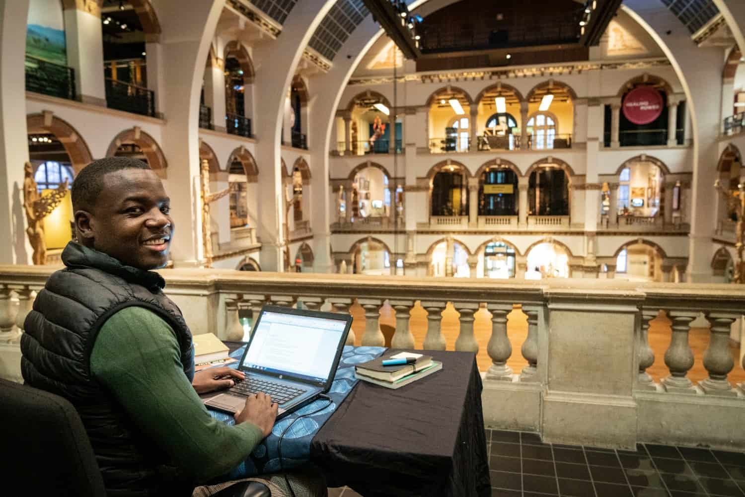 Gershwin Bonevacia (1992), schrijver en stadsdichter van Amsterdam, ruilt zijn thuiswerkplek in voor een bureau in een door de lockdown gesloten Tropenmuseum.