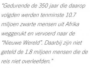 Gedurende de 350 jaar die daarop volgden werden tenminste 10.7 miljoen zwarte mensen uit Afrika weggerukt en vervoerd naar de “Nieuwe Wereld”. Daarbij zijn niet geteld de 1.8 miljoen mensen die de reis niet overleefden.