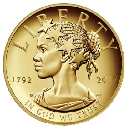 “De 2017 2017 American Liberty 225th Anniversary Gold Coin is de eerste in een serie van 26 karaats gouden munten met ontwerpen waarin Vrijheid wordt uitgebeeld in moderne vormen, zoals ontwerpen met Asian-Americans, Hispanic-Americans en Indian-Americans; om de etnische diversiteit van de Verenigde Staten te vertegenwoordigen,” schreef de Munt in een persbericht.